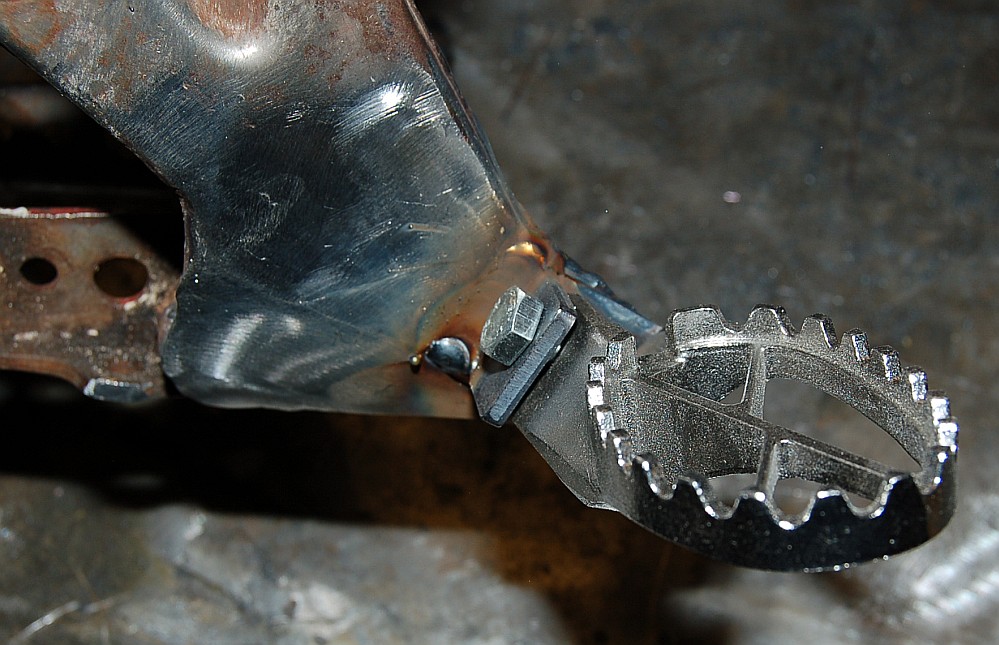 Its a good idea to weld the new footrest mounting tab a little inboard on the right hand side, which provides a bit more clearance for the kick-start lever, and may mean there is no need to heat and bend the lever to clear the end of the longer modern type footrest. In general the stock brake pedal stop can be adjusted, so the brake works fine with rests relocated in this way, but obviously this is something that needs to be carefully checked before painting or powder-coating.