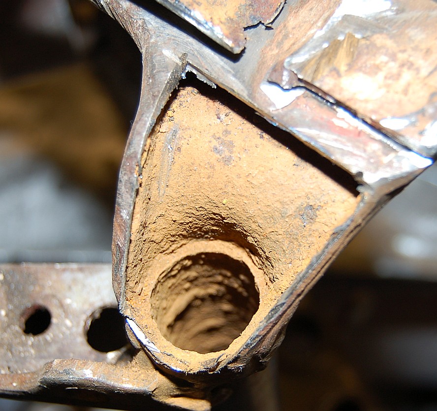 If repair is needed then the area shown in the photo must be removed entirely, and this can be done through careful use of a 1mm cutting disc. When the damaged metal has been removed its possible to assess the condition of the inside of the frame, and to see whether or not any more corroded metal must be removed. The next step is to make repair sections using 3mm mild steel sheet, and carefully form them to exactly the same shape as the metal that's been removed.